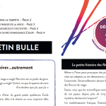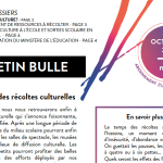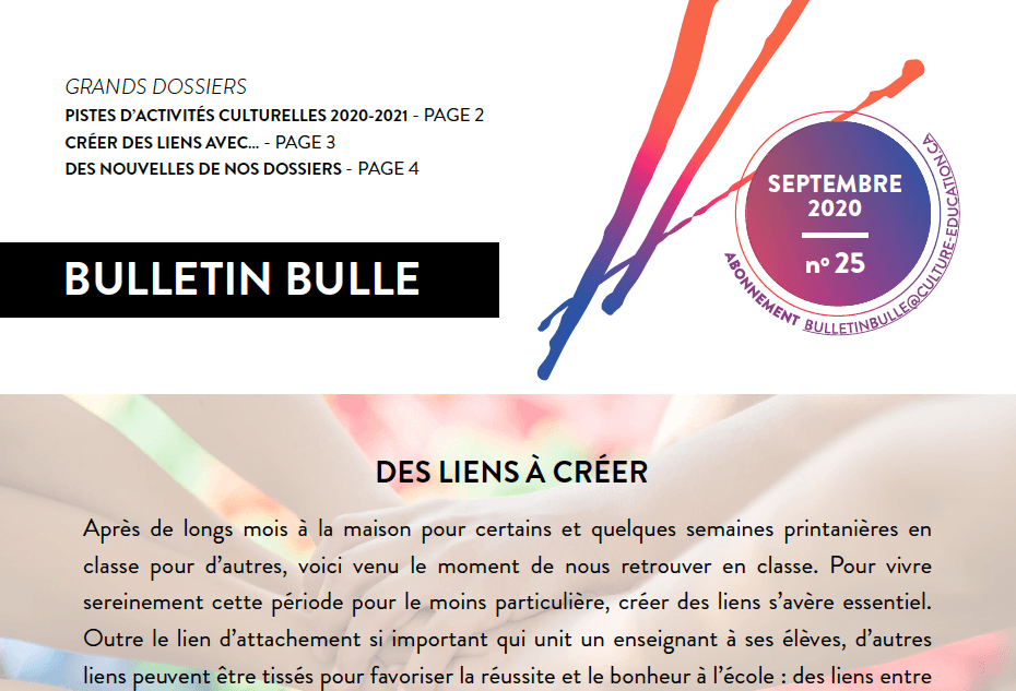 Voici le premier numéro du Bulletin Bulle de l’année 2020-2021! Vous y trouverez des nouvelles des dossiers Culture-Éducation, des pistes d’activités interdisciplinaires pour le primaire ainsi qu’une foule de ressources qui vous aideront à créer divers liens avec vos élèves en ce début d’année scolaire. Bonne lecture!