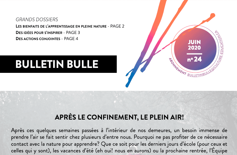 Dans notre nouvelle édition du Bulletin Bulle, nous vous proposons de sortir du confinement et d’amener votre classe à l’extérieur. Découvrez ce numéro pour en apprendre davantage sur l’enseignement en plein air et avoir des idées d’activités.