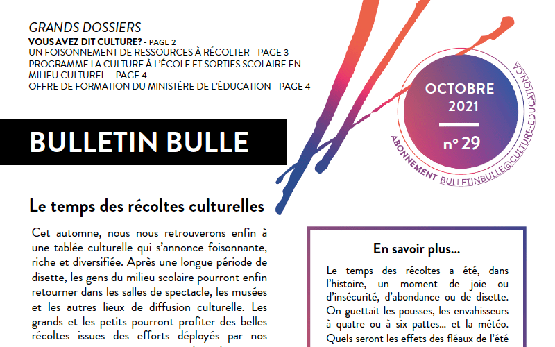 Cet automne, nous nous retrouverons enfin à une tablée culturelle qui s’annonce foisonnante, riche et diversifiée. Après une longue période de disette, les gens du milieu scolaire pourront enfin retourner dans les salles de spectacle, les musées et les autres lieux de diffusion culturelle. Les grands et les petits pourront profiter des belles récoltes issues des efforts déployés par nos créatrices et nos créateurs pendant des temps plus difficiles. Ce premier numéro de l’année scolaire 2021-2022 est une occasion privilégiée de participer à ce grand partage culturel. Apprenez-en davantage sur le mot culture, familiarisez-vous avec des repères culturels ancrés dans l’univers de l’agriculture et découvrez une foule de ressources à exploiter en classe.
