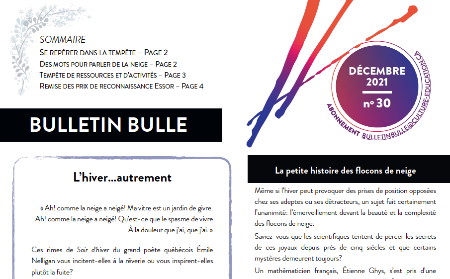 Que vous soyez dans le camp des amateurs de l’hiver ou de ses détracteurs, nous vous promettons un numéro du Bulletin Bulle débordant de ressources culturelles et qui, peut-être, vous redonnera envie d’apprécier l’hiver.