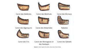 Sources : Les fiches « Canot d’écorce de bouleau » de L’Encyclopédie canadienne et « Moyens de transport » de la plateforme EDUTIC : AKI – Société et territoires autochtones de l’Université du Québec à Trois-Rivières, le film César et son canot d’écorce de l’Office national du film du Canada et la page « Fabrication de canot d’écorce » de l’Inventaire des ressources ethnologiques du patrimoine immatériel (IREPI) de l’Université Laval.